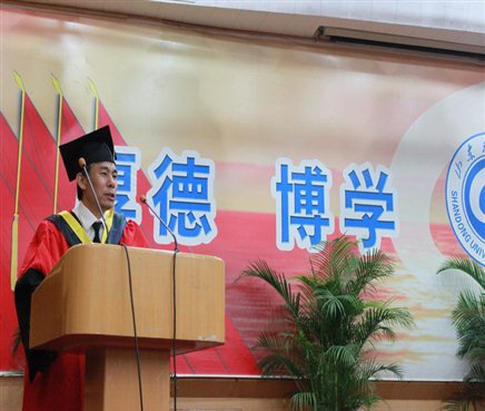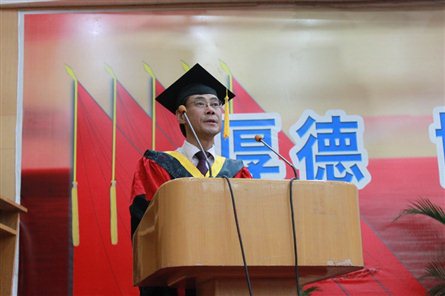 典礼在雄壮的国歌声中开始。田贵山发表讲话,祝贺学院425名毕业生顺利获得学士学位。他说2013届毕业生积极进取,有59名同学加入了中国共产党;勤奋苦读,有146名同学考取了研究生,将继续自己的学业;德才兼备,有24名同学获得了山东省高校优秀毕业生;甘于奉献,有2名毕业生报名支援西部地区的建设。几年来,你们见证了我院一步步的发展,也为学院的发展做出了自己的贡献。在即将离别之际,他希望同学们一要牢记学海无涯,与时俱进。只有坚持不懈地更新知识、充实自己、脚踏实地、与时俱进的人才可能成为适应社会、适应时代的真正的精英人才。二要牢记生而有涯,学会感恩。感恩是社会和谐的粘合剂,和谐社会需要感恩,如果人人都有一颗感恩的心,那么,社会就会更美好,感恩之心,既能幸福他人,也能快乐自己。三要牢记正值年轻,努力拼搏。希望大家在面对困境时要自强自信,要有艰苦奋斗的精神,今后无论处在什么样的位置,只要有一颗火热的心,只要热爱生活,热爱事业,奋发图强,就能在平凡的世界中演绎出不平凡的人生。他希望毕业生们到新的岗位以后,扎实工作,开拓进取,成就事业,恪守诚信,奉献社会,以优异的成绩证明自己的价值。