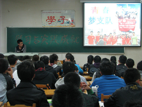 刘磊首先提出“学生,为学习而生”的主题思想,作为国家奖学金的获得者,他从自身经历出发悉心为同学们分析和解答学习中存在的困惑,与在场同学分享三年来学习的苦与乐,针对同学们提出的如何解决学习中的惰性问题,他这样建议,抗击懒惰的最有效途径是树立目标,有计划的去完成,积少成多。此外他还告诫同学们在打工和学习二者之间切不可本末倒置。他说道,进入大学,机会虽多,但优秀的学习成绩也往往是你获得许多荣誉的前提,我们的未来还是需要坚实的知识来铺路。随后,刘磊从校内实践和校外实践两方面来进行阐述大学生应该如何进行社会实践。谈到校内实践方面,他积极鼓励同学参加科技创新类的学校活动以锻炼自身的创新能力,并参与学生组织以锻炼自身的社交能力。其后,刘磊则通过播放其参加的“青春梦之队”暑期实践团活动的ppt,以军民共建和保育院支教为主线,矿山走访和调研为辅线为在场同学展现了一幅实践全景图,由此让大家对社会实践的形式有初步的了解。实践活动中传递出来的正能量感染着在场的每一个人,其中以实践队员们与孤儿院孩子亲密接触的场景令人尤为动容,大一新生纷纷表示今后会积极参加此类的活动。刘磊说,社会实践中收获的不仅是知识,更多的是团结协作的精神以和不畏艰险的意志。大学时代尝试去做一次社会实践,无论心酸苦楚,当你回首,会觉得弥足珍贵。