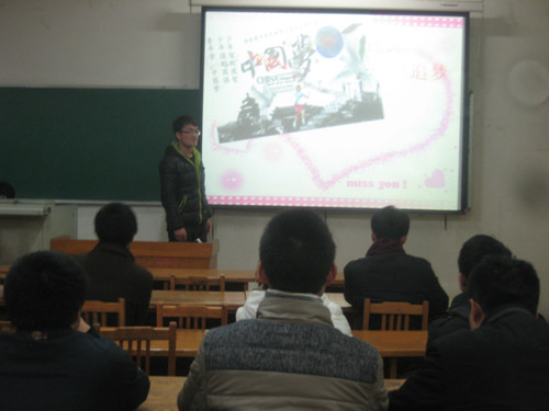 此次比赛共有来自全校的10组队伍入围决赛,参赛选手以ppt辅助进行作品展示、创意解说。“与梦想一同前行”团队海报以紫色为主基调配以充满梦幻气息的背景,海报的左侧是一个朝着前方振翅飞翔的天使,天使被笼罩在星星与花瓣中动作轻盈。作品整体给人以耳目一新之感,旨在传达出“我们正年轻,青春当梦想”。随后出场的“中国梦“团队却是以主打写实为特色,海报下方有一奋力奔跑的少年沿着楼梯蜿蜒而上,楼梯通过一扇门与“地球”相连,地球右侧分布着钓鱼岛和台湾,画面的中央还分布着数量众多的和平鸽,告诉我们“少年强则国强”,保卫祖国、爱护家园还需我们敢于放飞梦想勇于拼搏。而“梦”团队则是完全跳脱出海报制作的单一途径,创新的用照片拼接的方式记录下一张张笑脸,记录他们追梦的过程,引发了在场观众的共鸣。