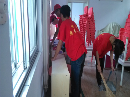 在参观完整个幼儿园后,调研团开始着手清理教室。由于该园成立较早,屋内墙壁大多损坏,利用这个暑假粉刷了墙壁,地面和物品摆放杂乱。今天需要整理的是小班的三个教室。地面上倒处都是粉刷落下的白灰料,石老师借来铲子,调研团的3名队员负责清除地面污渍,另外3名队员负责拖地,剩余2名队员负责擦洗橱柜。仿佛小学大扫除热火朝天的场景又闪现在眼前,大家干劲儿十足,经过3个小时的打扫,地面已经干净,队员们同石老师一起将物品归位。队员们看着这设施齐全,焕然一新的教室,忘记了疲惫,不禁唏嘘感叹自己没有读过如此好的幼儿园,更没有像现在的孩子有着那样丰富的童年记忆。