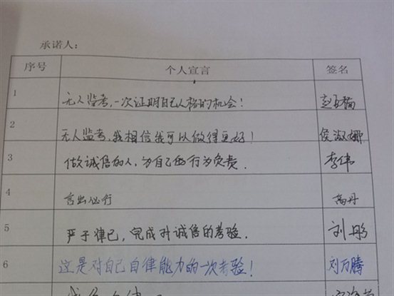 目前,“无人监考”制度在全国众多高校广受欢迎,我校也时刻关注相关动态。近年来,WilliamHILL中国顺应高校教育体制改革,积极响应学校号召,致力于一系列教学新模式的探索。为加强学院学风建设,培养学生诚信做人,诚实做学问的良好品德以及引导学生树立自信、自尊、自主、自律的坚强意志,同时为构建诚信和谐文明校园创造良好的育人环境,2014年年初,该学院推出部分班级由传统考试转向学生自律考试——无人监考的改革。现如今,该院资源循环1201班主动申请并积极组织实践,该项制度正在逐步完善。