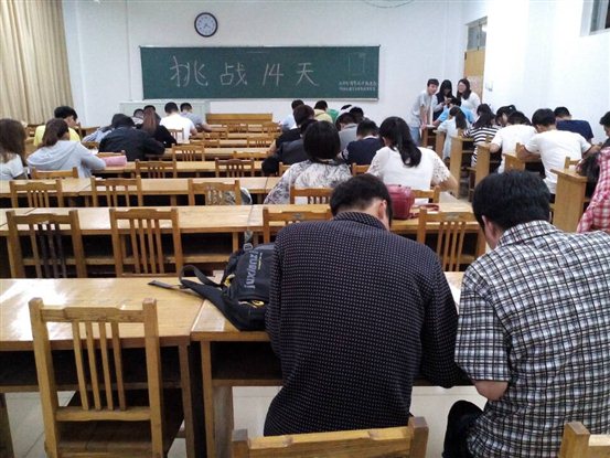 由资环学院大学生青年成才促进社和宿管委共同举办的“挑战十四天”活动在五月十日晚进行英语测试。此测试就是对参赛学生进行英语四级单词考察,测试他们是否在十四天中坚持背诵单词。在晚上七点整,各参赛学生在12号楼408、412教室集合完毕,进行测试。