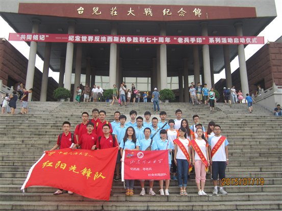 来到台儿庄大战无名英雄墓,祭拜为国捐躯的先烈,并举行了小小的祭奠仪式,增强了同学们爱国精神;在馆长的帮助下,在讲解员详细的解说之下,同学们全面的参观了大战纪念馆,同时队长献上了准备好的锦旗,观看那遗留下来的点点滴滴,让同学们明白了战争中的血腥和残酷,不寒而栗,更珍惜现在和平的生活,懂得珍惜眼前来之不易的幸福。回忆着那张李宗仁在站牌下的照片,同学们来到了李宗仁史料馆,详细精确的记载,还原了历史的真相。那遗留下来的火车头,又曾肩负起多么艰苦的使命。顺利的行程也免不了遇到一切挫折,为了迎接抗战胜利70周年,“战史陈列馆”进行了全面的装修和整改,出于安全没有进行参观。同学们来到了附近的公园里向当地的居民们做问卷调查,更多的了解当地居民对抗战老兵的认识,并在调查过程中同学们获得了附近更多的健在抗战老兵的信息,于是在实践的最后时间里,同学们制定了拜访老兵的计划。同学们认真的拜访台儿庄大战见证人——李敬善,并且得到了当地电视台的重视,对我们的活动进行了报道,让更多的人了解老兵,走进老兵的生活,同时我们还拜访了胡夫伦、吕学仁抗战老兵,了解那段峥嵘岁月,增爱国之志。在实践过程中,队长积极联系当地团委、爱国主义基地,同学们每次认真的写新闻,发新闻,最大范围内宣传我们的活动。我们没有办法阻止时间的流逝,但是我们可以守护那些历史。