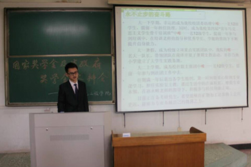 会议伊始,王寿朋对学院国家奖学金、省政府奖学金的评选要求做简单陈述,并介绍此次答辩会分为自我展示,评议小组投票,现场计票三个环节。自我展示环节,每位候选人以PPT的形式,从个人学习成绩、思想建设、学生工作、科技创新、社会实践等方面进行精彩陈述。成绩优秀的他们均获得过省级以上奖励,或是各项竞赛中取得优异成绩,或是社会实践中取得优异成果,一张张的奖状证书下是他们积极向上的心态和咬紧牙关的坚持。