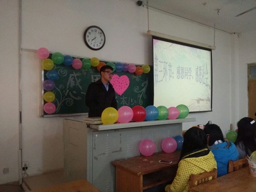 此次班会由环本1501班班长滕昊蔚主持,大致由“感恩父母”、“感恩老师”、“感恩同学,感恩社会”三个环节组成。首先,他向同学们展示介绍了感恩节的由来,从提到“同学们最该感谢的人”就势带出“感恩父母”的话题,通过向同学们提出“你是否了解你爸爸妈妈”与“爱的天平”,表达了当代青年人对父母缺乏感恩的状态,引起了同学们的思考与自省。接着,以“父母,照顾你引导你的人”为序,滕昊蔚让班会进入了“感恩老师”环节,他从“照顾引导大家”方面指出,老师对大家的奉献一定程度上并不亚于各自的父母,同样值得大家去感恩。最后,从同学们的生活实际出发,“感恩同学、感恩社会”的话题就出现了,在滕昊蔚的一番讲述下,同学们似乎感受到了,感激磨难感激对手更感激朋友的必要性。