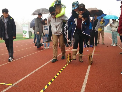 虽然比赛当天下着密密的小雨,但是丝毫阻挡不了同学们的热情。下午两点,比赛正式开始。第一项活动为“信任·竞答”。参赛者每组三人。一人蒙上眼睛背起头戴帽子的队友,在另一位队友的指挥下到达终点。率先用帽子顶部的针刺破气球的队伍可进行答题。每答对一题,可得一分。