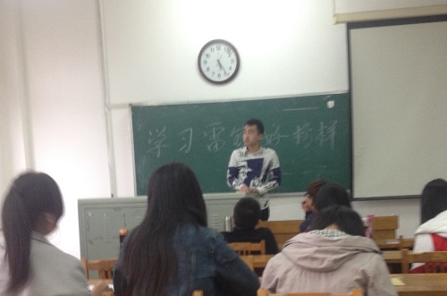 会议伊始,班长蒋天存简单介绍此次交流会的目的,旨在让每一个同学都领悟到雷锋精神的真谛,进而能将雷锋精神传承下去并发扬光大。随后,班长为同学们解说关于雷锋精神和雷锋事迹的PPT,展示过程中,同学们积极发言关于对雷锋的认识。接着,主持人提出关于社会上倍受争议的“扶与不扶”、“帮还是不帮”的问题让同学讨论发言,同学们各抒己见,分享自己的想法。最后,班长做交流会总结。