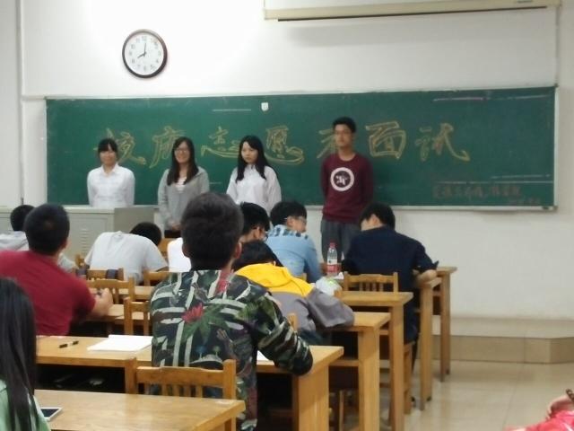 面试开始之前,参加面试的同学都在台下认真准备。7点面试正式开始,刘富豪首先对大家的到来表示感谢,并期待大家好好表现。随后参加面试的同学分批上台进行自我介绍,每次上去四个人,依次介绍自己并阐述自己能够胜任此次志愿者的优势。当面试同学依次介绍完之后,各位评委进行提问,各位同学对此次面试提问准备地相当充分,针对评委提出的各种问题,同学们都灵活应对,充分展示了个人风采。面试结束后,刘富豪做了简短的总结,并对大家的到来再次表示感谢。各位评委对此次面试结果很满意,并坦言这将是一场激烈的角逐。
