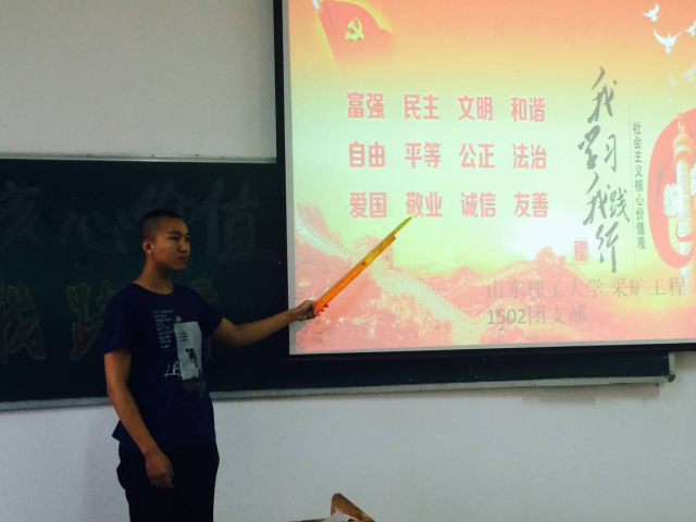 为深入贯彻落实党的十八大精神,促进同学们自觉培育和践行社会主义核心价值观,引导同学们树立正确的人生观、世界观、价值观,采矿1502班于5月27日下午,在12号教学楼406室,召开了“社会主义核心价值观”主题班会。此次班会由采矿1502班班长李明昊主持,采矿1502班全体成员参加此次会议。