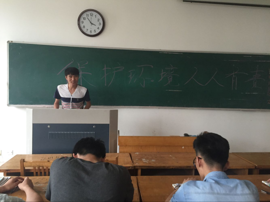 会议伊始,宣传委员张辉进行了发言。他指出此次会议的目的是让同学们进一步了解世界环境保护日,并通过实际行动贡献出自己的一份力量。他表明6月5日是世界环境保护日,今年世界环境日主题为打击非法野生动物贸易,我国相应环境日主题为“改善环境质量推动绿色发展”。随后,他从大学生的角度发出倡议,希望同学们能够在衣、食、住、行等方面低碳节约,拒绝浪费。接着,他号召同学们转发班级微信公众号推送的以环境为主题的文章,使得更多的人了解环境保护日,践行绿色生活。同学们纷纷表示赞成,积极响应。最后,班会在同学们的掌声中圆满结束。