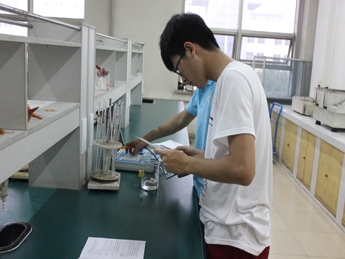 在测试开始之前,实践队员首先将存放在恒温生化培养箱中的水样取出,并抽取一部分水样作为检测电导率的样本。之后,实验总负责人辛富森从环境工程实验室仪器储存室取来电导率测试仪,并给实践队员讲解一起使用的注意事项。在此之后,实践队员开始了对水样的电导率测试。在测试过程中,队员们配合有序,默契,保证了上述测定过程的顺利进行。最后的测定结果显示,马踏湖国家湿地公园的水纯度尚可,不是很好,也不是很差。