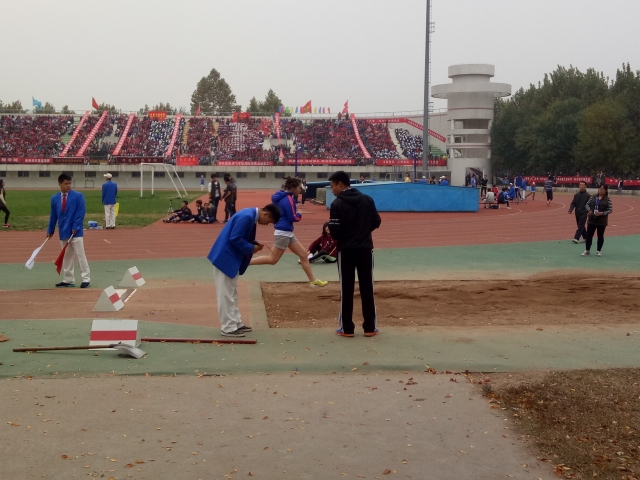 10月20号上午,在第二体育场东北角举行秋季运动会的女子跳远预赛。裁判分为两组,一组负责记录成绩,一组负责监察。