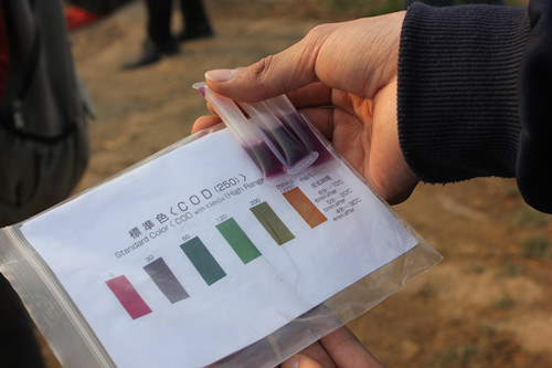 洁宇环保社成员们从理工大北门出发骑行到猪龙河河水源头,沿途对周边一些居民及施工人员进行了简短的问卷调查,调查结果显示,大部分人认为河流污染主要是由工业污染造成的,并且表示愿意参加保护猪龙河的乐水行动。在对猪笼河水进行考察的过程中,队员们在洁宇环保社社长李阳的指导下,通过观察河流的颜色、气味、水质以及河面漂浮物等具体了解猪龙河情况,同时他们也对周边的生态环境以及河流生态状况做了细致的调查。此外,队员们对排污口水样进行了提取与检测,针对猪龙河上游及高新区段的水样,他们用测水包进行检测,并用PH试纸来测试河水的酸碱度,通过测量数据来确定河水的氨氮含量和污染程度,最终通过对比得出水质标准。测量结束后,大家一同讨论造成河流污染的因素,并提出各自想法。
