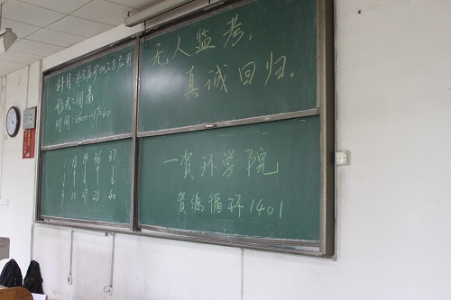 开考之前,黑板上写好“无人监考,真诚回归”的字样,同时也注明了考试科目、时间等信息,资源循环1401班同学主动把课本、书包、手机等一切与考试相关的物品上交,并按照学号有序坐好,准备迎接接下来的考试。任课老师马玉文简单强调了考试纪律和考试规则,随后发放试卷,考场中的同学们自觉自律,认真答题,诚信考试,整个考试过程井然有序,提前答完题的同学可以交上考试卷后提前离场。李栋祥对参与此次“无人监考”考试的同学表示了赞赏,同时表示,希望这种无人监考的考试方式能继续延续下去。“无人监考”是诚信的体现,而诚信是社会的需求,此种考试方式是对现有考试形式的一种创新,同时也让每一个参与其中的学生坚守内心的诚信,自觉增强学习的主动性,提升学生学习的动力,积极培育和践行社会主义核心价值观。