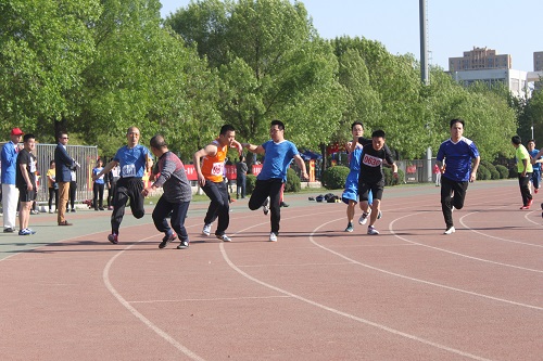 4月27日下午,在我校第二体育场内,我院教职工正在参加教工男子A组4×100米接力赛。