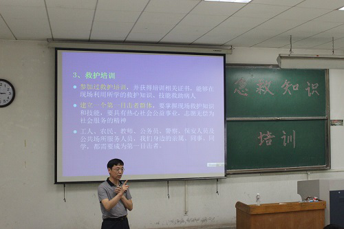 王卫老师在授课中首先用理论和几个实际案例向大家说明了急救的重要性,他说:“学习急救知识可以让我在他人发生紧急状况时救人,别人学习急救知识可以在我发生紧急状况时救我,希望同学们能够深刻认识到急救的重要性。”随后,他为参加培训会的同学介绍了救命黄金时间以及第一目击者这两个重要概念和做法,着重介绍了面对突发事件的基本急救方法及应对心脏骤停的正确做法,并亲自进行了现场演示。在实践环节,让参加培训的同学进行了现场实践和教学。