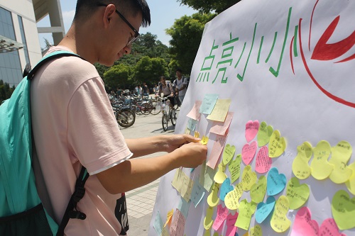 在此次活动的前期准备工作中,社团各成员既明确分工又相互协助,协同完成各项准备工作。宣传工作于5月16日中午开始,主要是在各餐厅门口发放宣传单页,同时向同学们介绍活动的开展形式。宣传现场布置有心愿墙,同学们可自由选择认领心愿。路过宣传场地的同学们纷纷向有关人员询问活动的相关事项,并积极主动的认领微心愿。