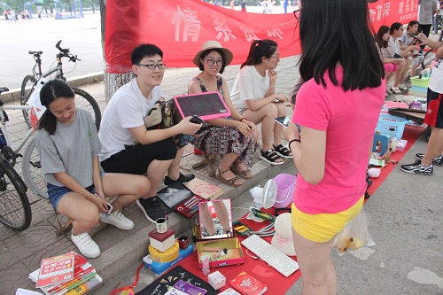 为了让大四毕业生的闲置物品得到再利用,给同学们创造一个社会实践的机会,自6月20日下午开始,我院宿管委联合权益部在第四体育场的篮球场举办跳蚤市场。同学们在道路旁边摆卖自己的“宝贝们”。小小的跳蚤市场,里面却是包罗万象,应有尽有,吸引了不少人前来淘宝。
