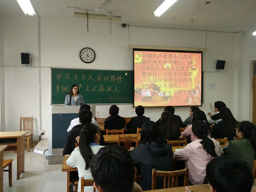 会议伊始,侯爽主持会议,并向同学们介绍了十九大召开的时间、会议流程、会议宗旨及会议精神等内容。紧接着,陈尚与仇吉超用PPT带领同学们学习了十九大的会议精神以及十九大的相关内容。紧接着,他们深入地向同学们介绍了习总书记报告中的四个重要概念:中国特色社会主义已经进入了新时代;我国社会主要矛盾已经转化;新时代中国特色社会主义思想;社会主义现代化强国。随后,同学们就十九大的内容展开了激烈的讨论,发表对十九大会议的看法。延伸到当代中国面临的机遇与挑战并结合大学生生活学习现状,他们一致认为新时代同学们应该有责任,有担当,以五有人才为目标。接着,候爽给大家播放了习总书记关于十九大讲话的视频,视频结束后教室里响起了热烈的掌声。大家认真学习,深刻领会本次主题会议的精神,纷纷上台发言,就自己在此次班会中所学到的内容做了认真的总结。同学们纷纷表示将紧跟党走,不断提升自我,以优异的成绩向十九大献礼。同学们还针对会议真诚地提出了自己对团支部建设的建议。会议最后,候爽对本次会议做了总结,并表示今后自己会认真听取同学们的建议,努力做好团支部建设工作。