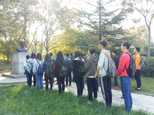 此次团日活动分为三个环节。活动伊始,同学们一起来到来到我校图书馆南侧的冯思广烈士纪念雕像前,举行对冯思广烈士的缅怀活动,同学们一起学习冯思广同志舍己为人的大无畏精神,并表达了对冯思广的悼念和敬佩之情。随后,同学们在图书馆草坪处集体合唱歌曲《国家》,以此来表达内心对祖国的热爱之情。紧接着,班级里部分同学精心准备了歌颂中国共产党光荣事迹的诗朗诵,同学们认真倾听,活动氛围十分浓厚。最后一个环节,大家一起开展了有关十九大的座谈会,会议开始前,有许多热爱书法的同学们积极主动地创作了“欢庆十九大”的主题黑板报,不仅切合了此次活动的主题,而且使此次团日活动内容更加丰富多彩。随后,班长赵博文具体介绍了会议的主题,并带领全班同学一同观看了中共十九大的回放,使同学们对十九大有了更加深刻更加全面的了解与认识。观看过后,大家积极踊跃发言,表达了自己对十九大的看法,同时也表达了对未来中国发展的希望。