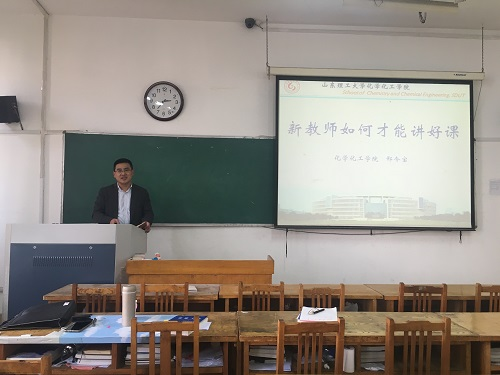 会议伊始,邢令宝对大家作出了优秀的教学示范,他结合自己参加青年教师讲课比赛的经历,以自己制作的《有机化学A》中的“甲烷的卤代反应”PPT为范本,给大家展示了他的教学特色。首先,他简单地介绍了自由基的概念,并由此引出了烷烃与卤分子的反应,并通过环环相扣的实验方式阐明了反应基理,框架紧密,思路清晰。接着,邢令宝就“新教师如何才能讲好课”这一主题向各位青年教师作出了细致全面的讲解。他从怎样备课、教师讲课应该注意的问题、怎样能让学生们注意听讲及教师讲课有哪些好方法等七个方面详细的向大家讲解并分享自己的教学经验。他表示要想把课讲好,就要“教学有法,教无定法,贵在得法”。邢令宝也分享了他的教课心得:要让学生喜欢自己的课,首先要让学生喜欢自己,自己也要喜欢自己的学生,更应热爱自己所教授的课程;内容上要引人入胜,抓住学生的注意力;板书简洁美观,引导学生清晰的思路;课上巧设问题,使学生思维处于活跃状态;讲出课程特质,让学生听出课程味道;跟踪课程最新发展动态,激发学生兴趣;营造良好的课堂气氛,以情感染学生。最后,他祝愿青年教师早日站稳讲台,成为更加优秀的教师。