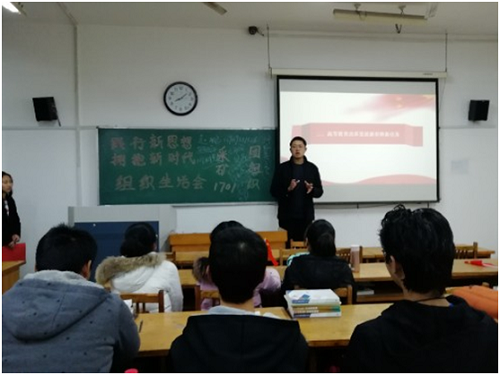 首先,刘啸对参加此次会议的赵鹏老师进行了介绍,欢迎赵鹏老师的到来。紧接着,刘啸以短视频引出本次团组织生活会,在视频中向同学们介绍了本次会议的主题,视频以十九大为主,节奏感强烈,赵鹏和同学们认真观看。接下来,赵鹏用PPT向同学们简单介绍了我国当前的发展状况,分享了在我国经济等方面取得的令人振奋的成果,同时传达十九大的中心思想,强调中国共产党以人民为中心的发展思想,通过习总书记的例子告诫同学们培养良好思想的重要性。另外,赵鹏向同学们介绍了有关双学位、国际交流生的问题,用大量国家奖学金、保研实例鼓励同学们努力提高专业成绩,并在学科竞赛方面勇于尝试,迈出自己的第一步。最后,会议第三个重要内容,党知问题提问,同学们在抢答题方面表现优异,准确回答了关于美丽中国“四大举措”等有关十九大的重要措施。