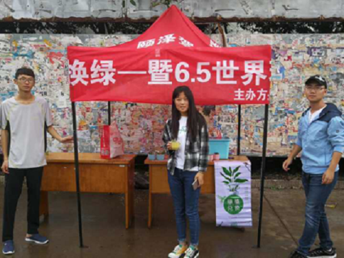 活动前期通过网络平台以及线下在第三、第四餐厅门口进行宣传,参与者可用空塑料瓶和废纸在活动当天到现场兑换绿植。活动伊始,全体工作人员有条不紊的搭帐篷、摆桌子、调秤、放植物。现场布置完毕后,孙乙宣布活动开始,各个工作人员各司其职——数瓶子、称废品、记录信息、发放植物、维持秩序。随后,参与活动的同学们来到现场,由于前几日宣传所起的作用,同学们都带着空瓶子、废纸壳来帐篷前兑换绿植,同学表示对于这个活动非常有意义,利用空瓶和占据空间的纸箱能够领到绿植一方面可以做到废品回收,废物再次利用,很好地践行了环保的理念;另一方面对同学们来说,领养的绿植增添了宿舍的活力,让绿色装点校园。