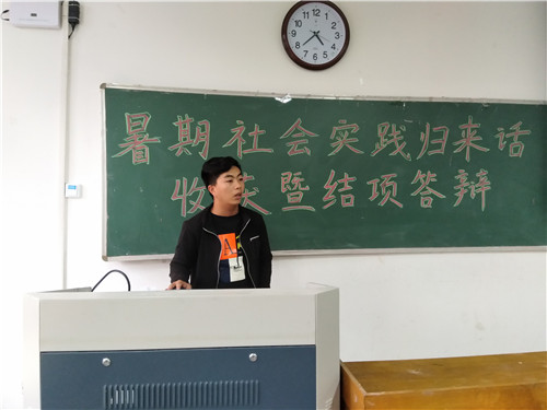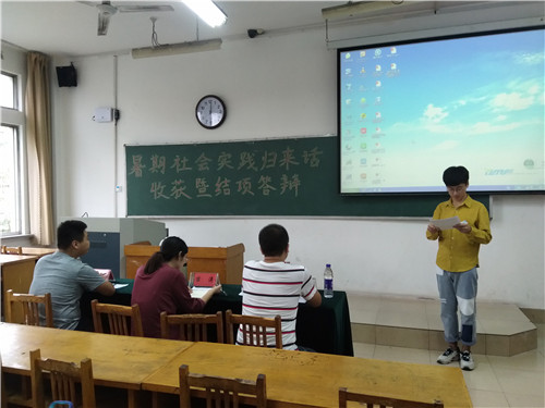 为了展示暑期社会实践成果,交流分享实践经验,9月21日下午,资环学院在12号教学楼412教室举行社会实践归来话收获暨结项答辩大会。我院团总支老师苗涛、17届生会主席葛文成、副主席叶其鑫以及十支社会实践团代表参加此次答辩。