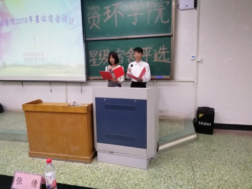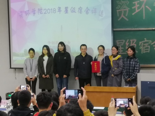评选开始,主持人向同学们介绍了评选评分规则:申报星级宿舍以记分形式进行评比,比分由报名表得分和PPT得分两部分组成,以最终得分评定星级宿舍。评选开始,各宿舍代表用精美可爱的PPT向同学们生动的讲述了宿舍故事,赢得了同学们潮水般的掌声。16号宿舍楼101的宿舍代表刘晴提出的一个宿舍最为重要的就是团结更是获得了老师和同学们的一致认同。各位代表发言完毕后,李祥栋对此次评选活动进行了总结,他表示:一个宿舍所必须的具备的就是高度的凝聚力,有了凝聚力,这个宿舍才能取得更高的成就。随后,他向同学们讲述了他对于宿舍面貌和风气的期望,强调了宿舍应该在学习、卫生等方面有所提高。对2018级新生,李栋祥期待他们能够做好宿舍工作,以在下一届星级宿舍评选中大放异彩。随后评委们针对每个宿舍的表现对其进行了评分。经评选决定,16号宿舍楼101宿舍荣获“2018年资环学院五星级宿舍”称号, 16号宿舍楼102等2个宿舍被评为“2018年资环学院三星级宿舍”,20号宿舍楼508等5个宿舍被评为“2018年资环学院一星级宿舍”。会议最后,宿舍代表上台领取获奖证书,各颁奖老师和获奖宿舍合影,在一片掌声中,此次评选顺利结束。