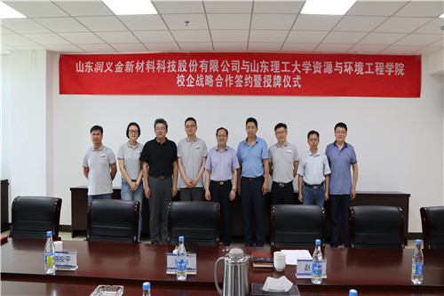 5月29日,资环学院与山东润义金新材料科技股份有限公司在淄博经开区管委会举行校企合作签约暨授牌仪式,淄博经济开发区工委副书记、管委会副主任陈安平书记、润义金公司董事长尚伟、总经理由明、副总经理赵政、学院陈俊德书记、李明副院长、专业及科研团队负责人张晓君、崔嵛等参加仪式,会议由润义金公司副总经理赵政主持。