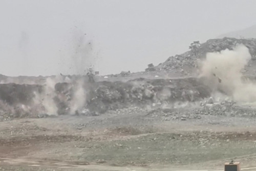 临近中午,矿山工作人员对爆破作业进行最后一次安全检查,确认无误后,矿区进入爆破倒计时。爆破开始,在山下可以明显地感受到爆破产生的震动,爆破结束,队员帮助工作人员撤除警戒线并跟随经理蔡新辉上山实地观察爆破效果。