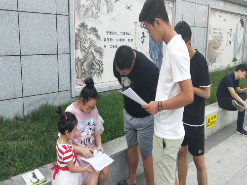 7月20号,调研小组成员分批、分时间段在学校北门、稷下湖、孝妇河等地分发关于孝妇河的调查问卷,对市民对孝妇河的环境状况了解进行调研。