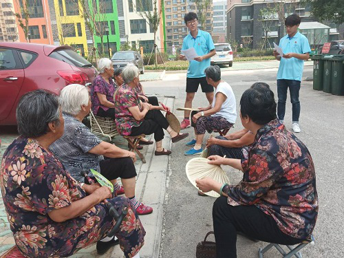 成员在早桌上部署上午调研计划和宣讲计划,将成员分为第一、第二两小队,深入社区进行工作。第一小队成员们在社区外围商户进行询问调查,居民认真配合,并填写完调查问卷。随后,第二小队进入社区对在外乘凉老人们进行宣讲。第一小队了解到,禧福凤凰城社区老人环保意识普遍较高,家庭内垃圾有及时处理垃圾习惯,但对于如何分类却不清楚,针对这一现象,第二小队成员对垃圾如何分类进行详细讲解。讲解中,小队成员从生活垃圾组成、产生量度、如何结合本地垃圾资源利用和处理方式进行分类、如何提高垃圾资源价值和经济价值几个方面重点阐述。老人们认真倾听,表示强烈认同。此外,居民表示:希望政府能够设立更多回收站点,加强宣传力度,对于垃圾分类问题政府可以出台政策,小区物业同时加强监管,用合理规章制度进行调控。