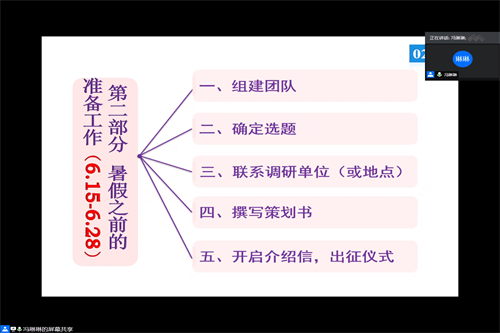此次动员会加深了学生对思政课社会实践的理解,明确了实践过程中的具体要求及注意事项,为学生的实践提供思路,引导同学立足疫情背景和思政精神,培养创新精神和实践能力。为暑期思政课社会实践的顺利开展提供有力保证。