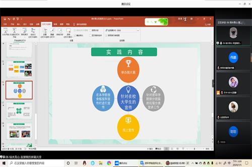 会议伊始,姜涛简要介绍评委和答辩会流程,各实践团代表依次答辩。答辩人以PPT为依托,阐述各自实践团的实践主题和具体内容。“水流涌动”、“知行合一”、“接点地气”、“绿水青山”、“逐梦矿业”实践团紧扣社会调研专题,分别从城市降水的利用、地摊经济、毕业生就业、专业认知等角度出发,创新实践形式,探索专业及社会热点问题的解决新思路。“桑榆非晚,为霞满天”、“心鲁有你”实践团分别立足疫情期间医养结合和脱贫攻坚推进问题,政策联系实际,深入社区调研。“赤‘资’红心”和“四海齐聚力·昭昭爱国行”实践团立足建党99周年背景,分别选取播放电影和调研红色老区文化精神的方式,传承红色经典,宣扬爱国精神。期间,答辩评委针对方案可行性、活动的宣传、实践结果的撰写及发表等工作提出建议。经评委老师协商,“桑榆非晚,为霞满天”、“接点儿地气”两支队伍被评为精品团队,其余7支队伍被评为重点团队。