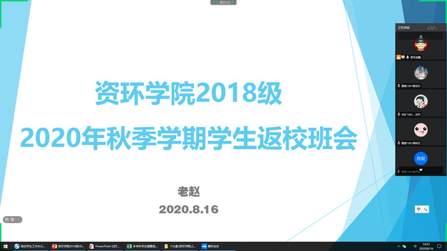 8月16日,WilliamHILL中国依托腾讯会议分会场依次举行秋季学期学生返校工作会议,团总支书记赵鹏、团总支老师高聪聪、单琳耀、张媛分别担任各年级会场主讲人。资环学院全体学生参加会议。