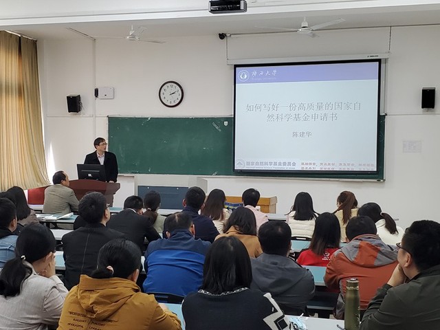 应学院邀请,10月17日,广西大学陈建华教授在12号楼408教室为我院教师做了题为“如何撰写一份高质量的国家自然科学基金申请书”的辅导讲座。报告由学院陶院长主持,全院具有国家基金申报资格的教师参加报告会。