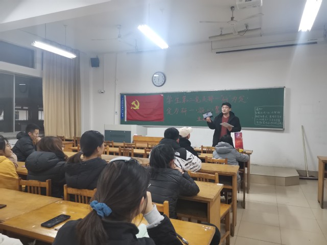 12月23日,学生第二党支部于12号教学楼412举行“一‘研’为定,定为研一,凝心聚力”主题党日活动,党日活动由党支部书记单琳耀主持,党支部18、19级全体党员参加。