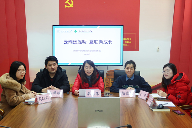 1月15日上午,学院在12号教学楼446会议室开展“线上慰问送温暖”活动,学院党委副书记秦伟伟,学生工作办公室主任赵佳佳,辅导员苗涛、单琳耀、高聪聪、赵宗超,线上走访4名经济困难学生家庭。