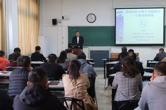 10月19日下午,校党委常委、副校长丛海林教授应学院邀请,在12号教学楼408室为我院师生做题为《我国材料卡脖子问题探讨——从微球到纳球》的学术报告。相关专业师生参加报告会,报告会由院长陶东平主持。