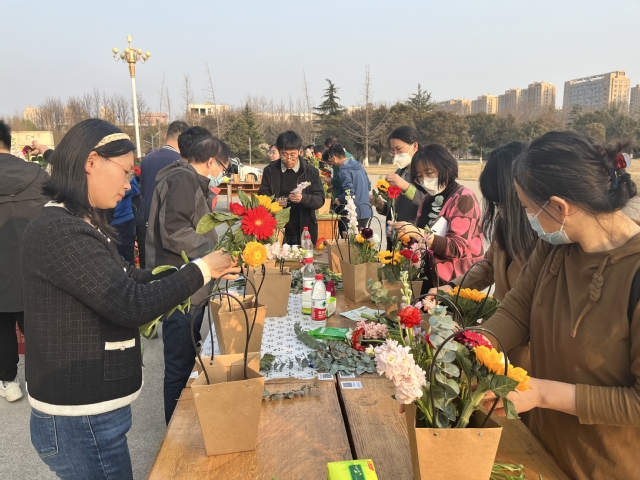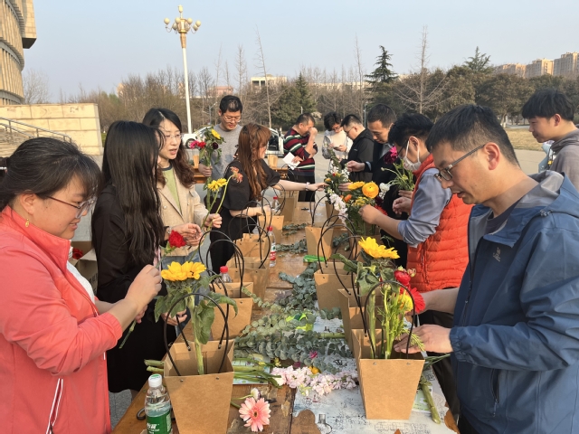 活动开始后,参加活动的老师在起点领取路线手卡并合影留念。沐浴着春天的暖阳,教职工们精神抖擞,由西校区一号实验楼出发,依次到达连心湖、大红炉、稷下湖、第二体育场、图书馆等指定打卡点,一路欣赏春日美景,一路畅谈工作与生活,充满着欢乐与活力。在健步走终点图书馆南草坪,老师们进行了插花体验,现场领取花篮及园艺工具,挑选自己喜欢的花卉,经过精心设计,向日葵、紫罗兰、康乃馨、尤加利叶等材料在各位老师的用心搭配下,错落有致地穿插在一起,一盆盆美丽的插花作品呈现在大家眼前。活动后,学院工会为所有参加活动的老师准备了纪念品。(赵宗超)