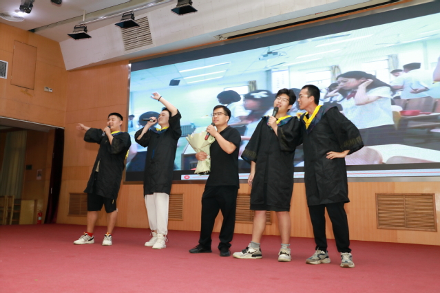 暖场环节,毕业班辅导员刘睿和毕业生代表深情合唱《再见》等歌曲,将真挚祝福送给即将告别校园的学子们。大屏幕上播放毕业纪念片,大家一起回首走过的青春岁月和难忘的校园生活,在歌声中挥动右手,致敬青春,感动全场。