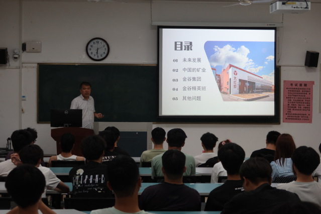 刘晓首先介绍了精英班的基本情况。随后,他从各专业的就业方向入手,指出矿业行业正走向转型期,降本增效、重视技术等成为矿业行业改革的新方向,开设“金谷”精英班对于统筹学院师生资源、开设创新实践课程、适应现代矿业发展要求、培养高素质应用型人才等尤为重要。