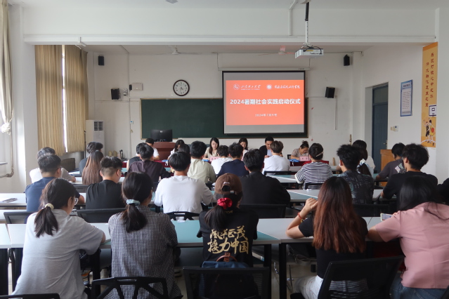 辅导员单琳耀首先介绍了学院2024年暑期社会实践工作的前期开展情况。社会实践精品团队队长黄炜坤作表态发言。秦伟伟为学院“三下乡”暑期社会实践团授旗。与会领导、老师为学院精品、重点团队授旗。