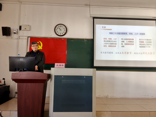 随后,丛海林以“聚焦发展需求 着力提升研究生培养质量”为题讲授专题党课。党课围绕党的二十大对教育、科技、人才的一体部署和习近平总书记对研究生教育工作作出的重要指示,引领大家深刻认识研究生教育承担的历史重任和发展趋势。丛海林勉励同学们积极响应时代呼唤、主动拥抱变化、适应变化,挺膺担当、团结奋进,努力提升学历,争做国家需要的科技人才,共同为科技强国建设作出更大贡献。