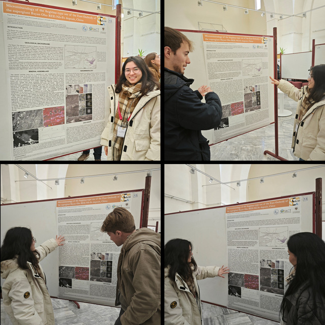 近日,第41届西班牙矿物学科学会议(SEM)与第27届西班牙粘土学科学会议(SEA)在西班牙塞维利亚举办。我院研究生王雅琴在导师刘睿副教授、格拉纳达大学José María González-Jiménez和Fernando Gervilla教授的悉心指导下,在会议上以板报的形式展示了题为“Micromineralogy of the Aegirine-type ore of the East Orebody of the supergiant Bayan Obo REE-Nb-Fe deposit, China”的阶段性研究成果。该研究聚焦于中国白云鄂博矿床东矿体霓石型矿石的超微观矿物学特征,结合显微结构、元素分布和矿物交代关系,逐步还原了四个矿化阶段的演化顺序:硅酸盐阶段-磷酸盐阶段-稀土碳酸盐阶段-萤石阶段。该研究成果深化了对白云鄂博矿床成矿过程的理解,为探索稀土元素在多源流体环境中的迁移、沉淀机理提供了重要科学依据,同时对稀土资源勘探和开发具有一定的指导意义。