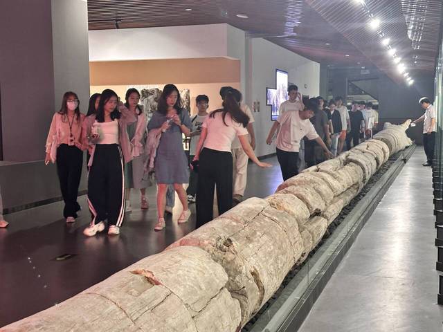 在博物馆讲解员带领下,毕业生党员依次参观了远古化石及矿物标本、地球瑰宝、薪火雷锋、红色征程等展厅,学生党员结合自身地矿、环境专业等学科知识,深入了解了地球的演化过程、生物多样性以及自然地质物品相关知识,并对矿石展品展开了讨论。