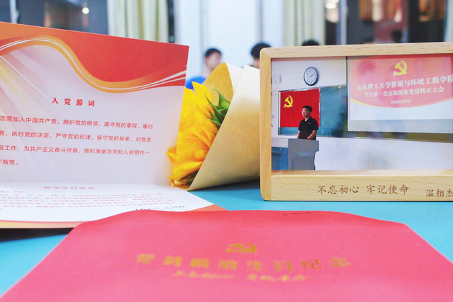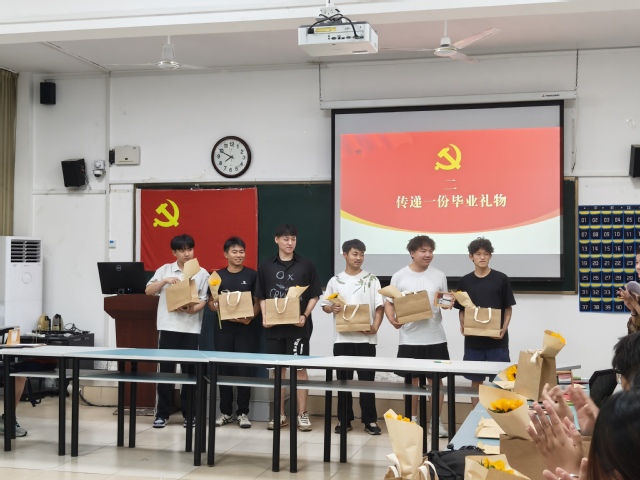 “这张记录了我加入党组织那天的照片,定格了我在校四年的成长”。支部书记赵佳佳与在校生党员共同为 21 名毕业生党员送上定制纪念相框,以独特的方式感谢毕业生党员的奉献时光,传递党组织的温暖期许。象征着“收获与向阳” 的向日葵花束,则承载着支部对毕业生的深切祝福。“向日葵始终追逐阳光,正如党员要永远心向党组织。”毕业生党员温相杰说。