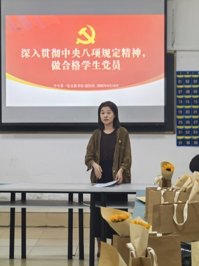 “走出校园,你们的党徽要戴在心里,更要亮在行动中。”党支部书记赵佳佳以 “四个永葆” 为核心讲授离校前最后一堂党课:永葆理想信念,在群众中树起先锋标杆;永葆校训精神,在行业里践行知行合一;永葆奋斗本色,在岗位中甘于吃苦奉献;永葆清廉作风,在生活中抵制奢靡之风。她特别展示了中央八项规定精神的深刻内涵,用典型案例警示党员“把严的主基调带入社会考场”。