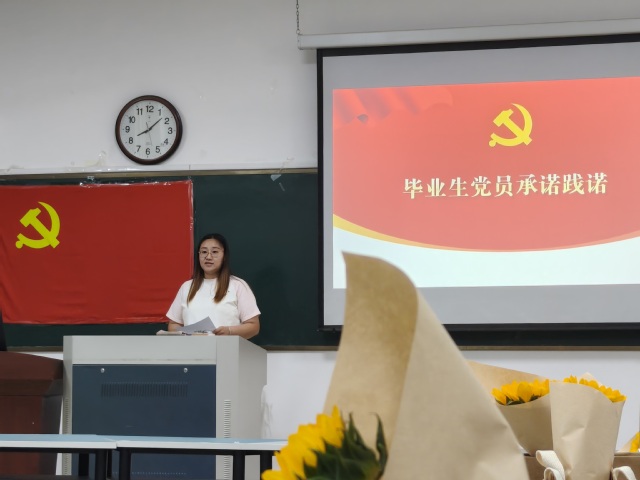 “2023 年 5 月 23 日,我在志愿书中写下‘愿以青春赴使命,一颗红心永向党’……” 毕业生党员代表张鸿鑫翻开自己的入党志愿书,坚定有力的重温了自己的入党初心。随后全体毕业生开展了“公开承诺践诺”活动。“在未来与地测、水文打交道的日子里,我愿主动扎根矿井巷道、深入水文监测一线;面对潮湿泥泞的环境与复杂数据,把每次现场勘测当作锤炼党性的熔炉,将每份数据精准记录视为对岗位的庄严承诺;以党员标准严格要求自己,虚心求教、知行合一,主动承担急难险重任务,让党旗在资源开发一线高高飘扬。”这是毕业生党员刘洪昊作出的庄重承诺。